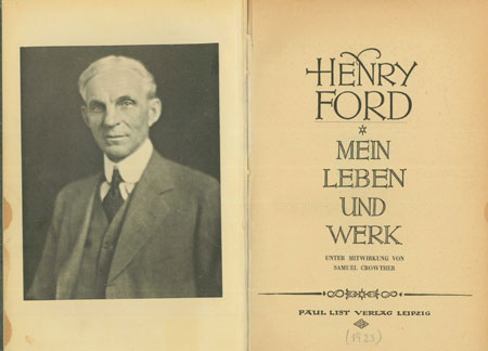 3 Henry Ford with Samuel Crowther, My Life and Work, Garden City 1923. Die deutsche Übersetzung von Curt und Marguerite Thesing unter dem Titel „Mein Leben und Werk“ erschien zuerst 1923 im Leipziger Paul List Verlag. Noch im Erscheinungsjahr wurden 29 Auflagen veröffentlicht, mehrere weitere bis 1930. Ab 1933 erschien die Autobiographie deutlich seltener als Fords erstes Buch „Der internationale Jude“ (siehe Anm. 5), ab 1938 bis 1942 dann allerdings erneut mehrfach. In anderen Industriestaaten erzielte Fords Autobiographie erheblich weniger Nachfrage: In Großbritannien gab es bis 1926 nur acht Auflagen, in Frankreich sogar nur zwei. Erwähnenswert ist zudem eine Übersetzung ins Yiddische, die 1931 in Varshe bei der Kultur Lige erschien.