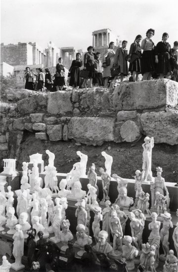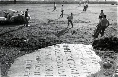 Der Teilbestand „Orient - Tabakländer“ im Fotoarchiv12 enthält eine Serie von 82 Schwarzweiß-Fotografien im Format 9 cm x 11 cm sowie ein dazugehöriges Portfolio mit 70 Abzügen im Format 18 cm x 24 cm. Beide sind nicht ganz deckungsgleich; insgesamt handelt es sich um 102 verschiedene Motive.13 Das Portfolio ist beschriftet „René Burri - Fotos Griechenland und Türkei“, die meisten Bilder sind auf Pappe aufgeklebt und mit kurzen Erläuterungen versehen. Sie zeigen ein breites Spektrum an Alltagsszenen: Eine barfüßige Frau überquert die Straße und zieht dabei ihren Schleier vor das Gesicht, eine Gruppe verschleierter Frauen widmet sich der Hausarbeit. Ein alter Mann mit Turban schaut in die Kamera, eine Gruppe alter Männer raucht und unterhält sich angeregt. Fischer bringen ihre vollen Körbe in den Hafen oder sortieren ihre Netze. Eine Gemüsebäuerin bringt ihre Waren zum Markt. Ein Bauer bestellt sein Feld mit einem Ochsenpflug, ein anderer reitet einen Esel und zieht ein schwer bepacktes Kamel hinter sich her. Tabakeinkäufer begutachten die Ware, Arbeiter ziehen Tabakblätter auf Fäden. Auffallend viele Bilder zeigen außerdem ein Nebeneinander traditioneller und moderner Lebenswelten: Eine Gruppe von Jungen spielt Fußball vor einer Kulisse aus antiken Säulenresten, bei einer anderen Fußballszene beherrscht eine steinerne Inschrift den Vordergrund. Schulkinder erfrischen sich an einem Brunnen voller arabischer Inschriften. Touristen klettern von der Akropolis herab zu den Gipsfiguren der Souvenirhändler. Ein Bagger verstellt den Blick auf die Moschee, ein blankpoliertes Auto parkt in einer engen Altstadtgasse. Zusammen ergeben die Bilder eine sorgfältig komponierte, persönlich und erzählerisch angelegte Reisereportage eines Fotografen, der sich offensichtlich viel Zeit genommen hat, einen Zugang zu Land und Leuten zu gewinnen.