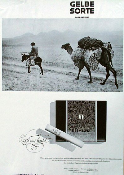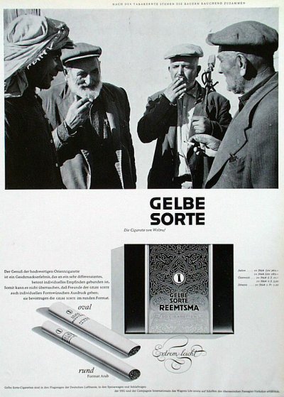 Orientmotive - d.h. meist stereotype Abbildungen „orientalischer“ Menschen, Pyramiden und Moscheen, wie Ornamente in der Packungsgestaltung und entsprechend klingende Namen - hatten bis zum Ersten Weltkrieg die deutsche Zigarettenwerbung dominiert und waren auch bis 1942 populär gewesen. Reemtsma hatte in diesem Umfeld insofern eine Sonderrolle eingenommen, als die Werbung für seine Marken einen sachlich-dokumentarischen Stil geprägt hatte. Als sich nach 1945 der Wandel der Geschmacksvorlieben und der Siegeszug der Virginiazigaretten abzeichnete, versuchte Reemtsma - neben Neuentwicklungen wie der im ersten Abschnitt erwähnten „Fox“ - bis Mitte der 1950er-Jahre, den Markt für Orientzigaretten mit wieder eingeführten Marken wie „Laferme“, „Salem“ und eben der „Gelben Sorte“ neu zu beleben. In diese Phase des Umbruchs ist auch der Auftrag an René Burri einzuordnen.