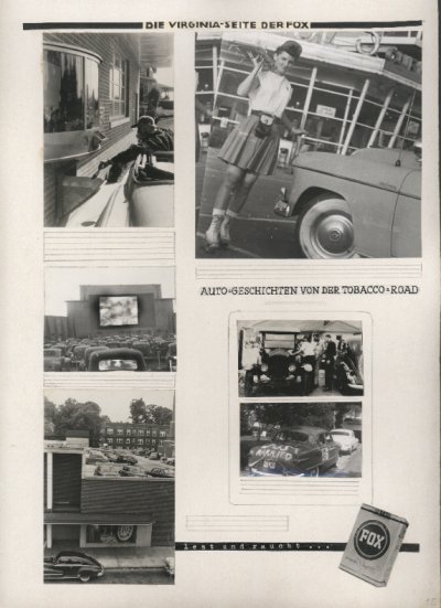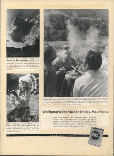 Zwei Männer - einer mit indianischem Federschmuck, einer mit Schirmmütze - rauchen gemeinsam eine Pfeife mit zwei Mundstücken. Ein schwarzer Junge lenkt einen Pferdeschlitten mit geernteten Blättern durch ein Tabakfeld. Die Bedienung eines Drive-in-Restaurants bringt auf Rollschuhen eine Bestellung zum Auto. Diese und weitere Fotografien befinden sich in einer Sammelmappe, deren Vorderseite den Titel „Wolfgang Weber in den Smoky-Mountains“ trägt3 sowie das Foto einer blonden Schönheit zeigt, die ein Tabakblatt in die Kamera hält, im Hintergrund ein Schild „Welcome to Virginia“. Insgesamt enthält die Mappe 23 Pappen, jeweils ungefähr 30 cm x 40 cm groß, auf denen unter der Kopfzeile „Die Virginia-Seite der Fox“ Fotos, Bildunterschriften, Texte und Zeichnungen zu kleinen Bildreportagen zusammengestellt sind.