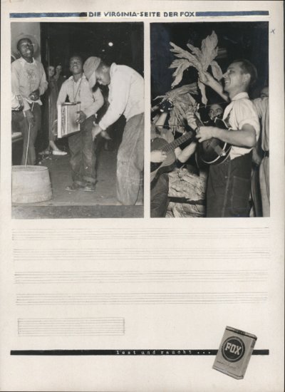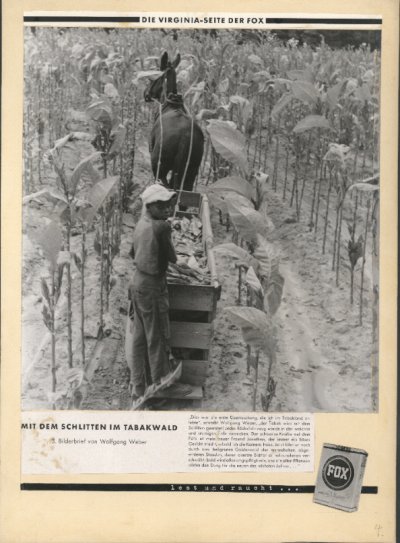 Ganz unten findet sich jeweils die Fußzeile „lest und raucht...“ mit dem Bild einer Zigarettenpackung der Marke „Fox“, die Reemtsma 1948 auf den Markt gebracht hatte. Die Pappen waren die Layoutentwürfe für eine Anzeigenkampagne. Aufnahmen und Texte stammten von dem bekannten Fotojournalisten Wolfgang Weber,4 der im Herbst 1950 eine längere USA-Reise unternahm. Zu dieser Zeit arbeitete Weber für die „Neue Illustrierte“; im Auftrag der Werbeabteilung von Reemtsma fotografierte er zugleich in den Tabakstaaten Virginia und North Carolina.5 Diese „Bilderbriefe“ des Fotografen sollten seine Reiseeindrücke aus der „Urheimat“ des Tabaks schildern.