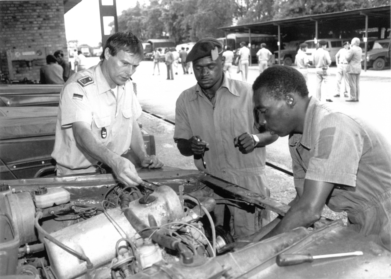 Die Beratergruppe bestand zunächst aus einem Hauptmann und zwei Feldwebeln, die hauptsächlich im Militärcamp Kanombe in der Nähe des Flughafens in Kigali arbeiteten.80 Wie in anderen Ländern lieferten die Bundesressorts im Anschluss vor allem dutzende Fahrzeuge und technisches Gerät.81 In den 1980er-Jahren fokussierten sich die bundesdeutschen Soldaten daher verstärkt auf die Instandsetzung des gelieferten Materials sowie auf die Ausbildung im Pionier-, Fahrschul- und Werkstattwesen.82 Die Beratergruppe wurde um zwei Kfz-Meister und einen Fahrlehrer zum Aufbau einer Fahrschule sowie einer Kfz-Werkstatt für die Ausbildung ruandischer Lehrlinge erweitert.83 1990 umfasste sie einen Offizier und fünf Unteroffiziere.84 Die Verstärkung ging auf Wünsche der ruandischen Partner zurück, die im Laufe der Kooperation anscheinend immer umfangreicher wurden.85